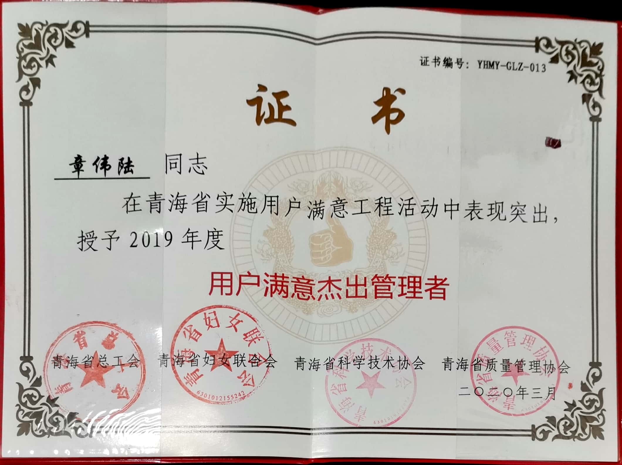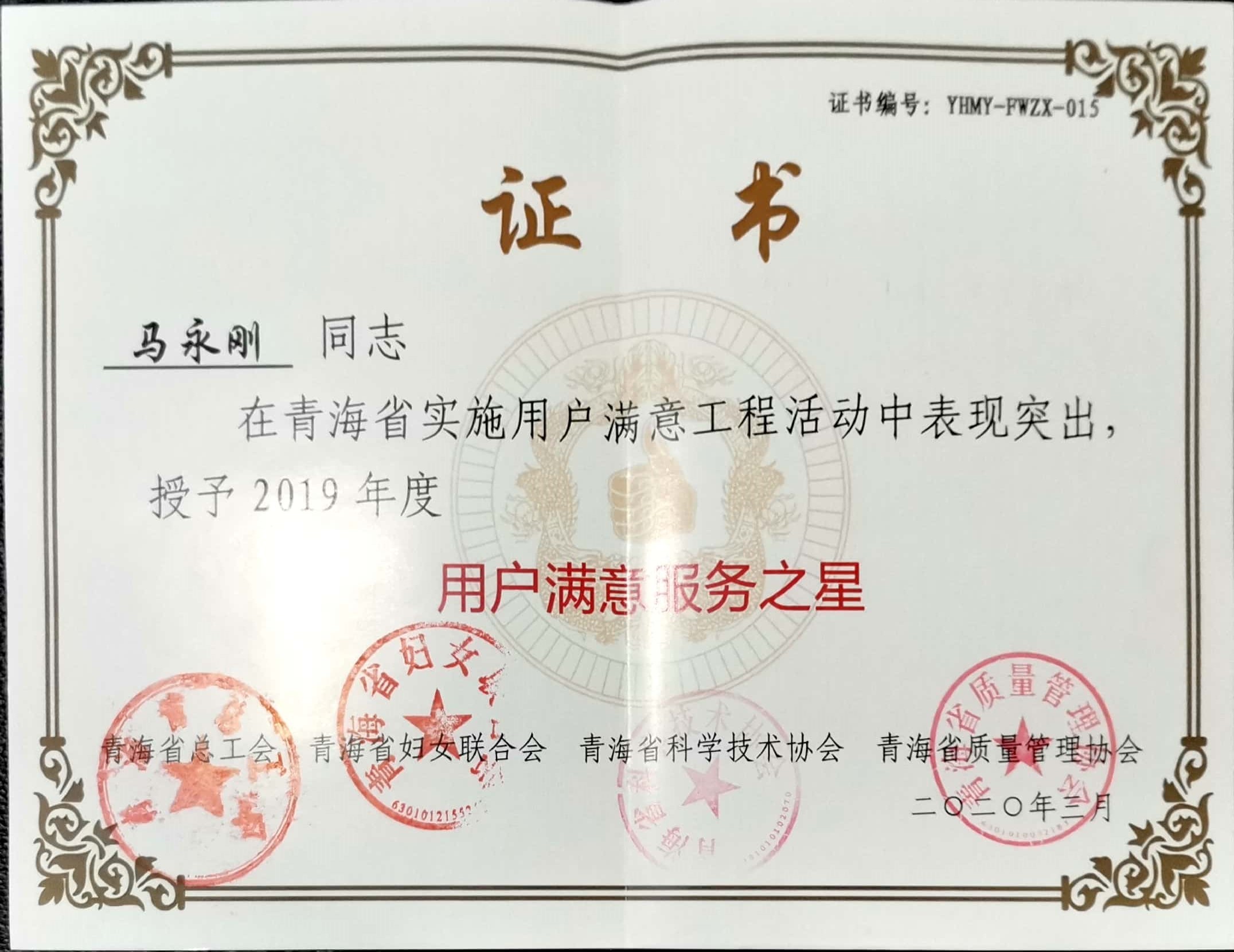 2019年度用戶滿意杰出管理者...